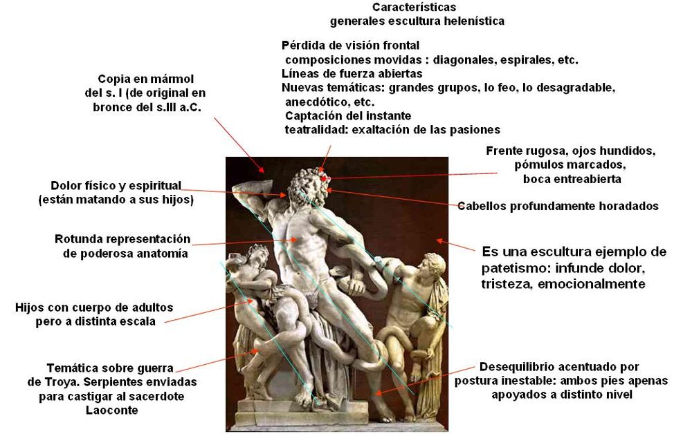 Exangües ante lo que veíamos, huimos, pero ellas, con avance seguro, se dirigen a Laocoonte, y primero las serpientes se enroscan en los cuerpos de sus dos hijos y a mordiscos devoran los desdichados miembros, después, al ir el padre en su auxilio con las armas en la mano, le apresan y le estrujan con sus grandes nudos. Por dos veces enroscan su escamoso cuerpo alrededor de la cintura, dos veces también alrededor de su cuello, sobrándoles las cabezas y las colas. Él intenta arrancar los nudos con sus manos, sus vendas se ven empapadas de baba y el toro herido cuando abandona el altar sacude de su cervis el hacha mal clavada. Y las dos serpientes huyen deslizándose hacia los altos templos, ganan rápidamente el santuario de la Tritonia y se esconden bajo los pies de la diosa, debajo de la redonda cavidad del escudo.