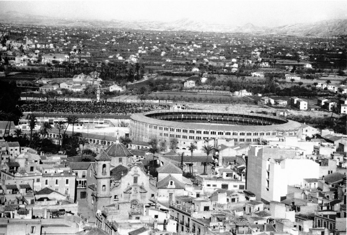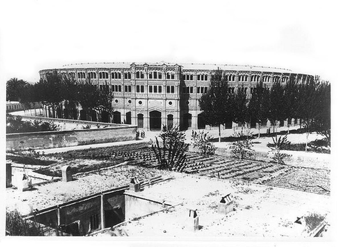 En cuanto a la fecha, no parece estar construido el campo de futbol, por lo que la foto sería anterior a 1924. La plaza de toros es de 1887. También encaja esto con la actividad del estudio Mateo en su etapa en la Calle Rambla.