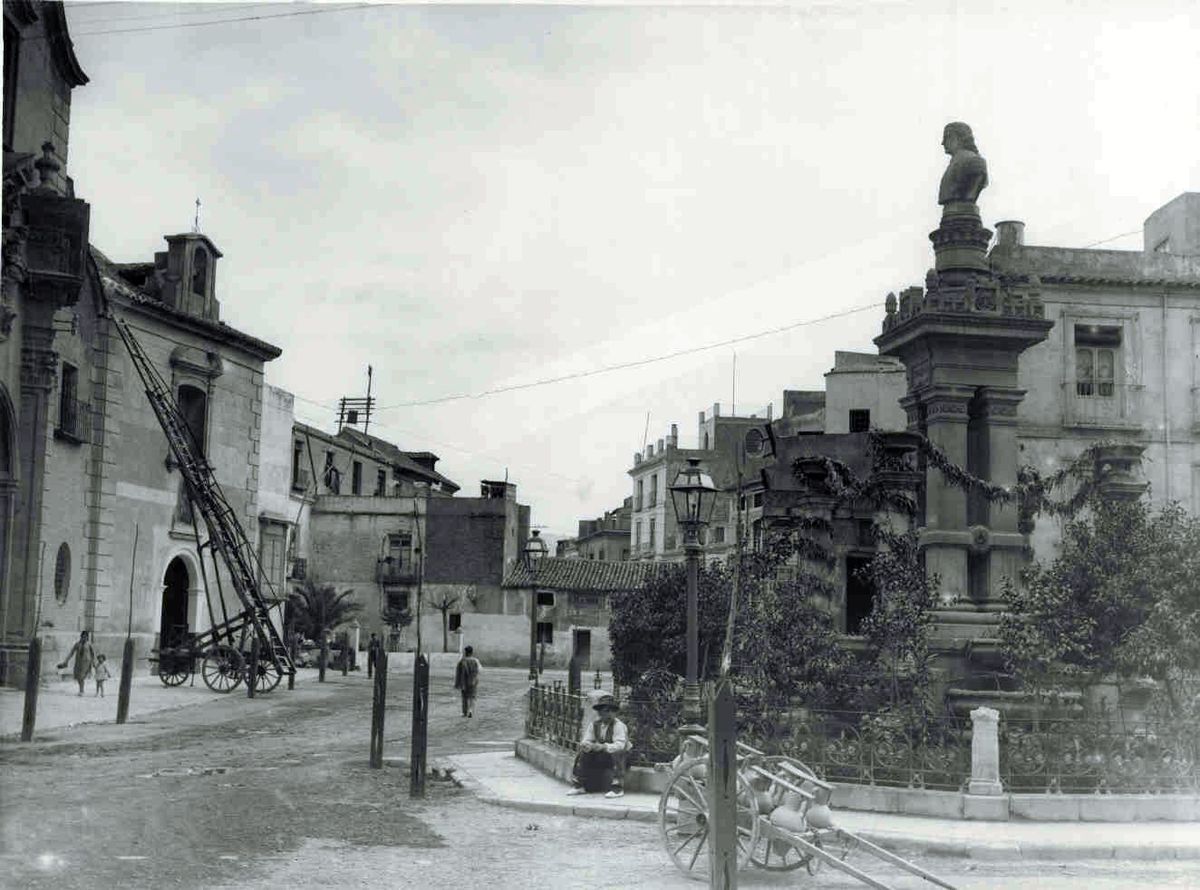 El monumento a Salzillo se inauguró en 1899 y todavía se ve que funciona como fuente. Quizá por eso la presencia del carro de cántaros y el ¿niño? del sombrero. ¿Sería el aguador?