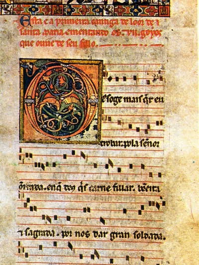 En la columna segunda, con letra encarnada, se titula y numera la Cantiga. A continuacuón, una gran letra capital decorada al gusto gótico francés da paso al texto, escrito en tinta oscura bajo el pentagrama.